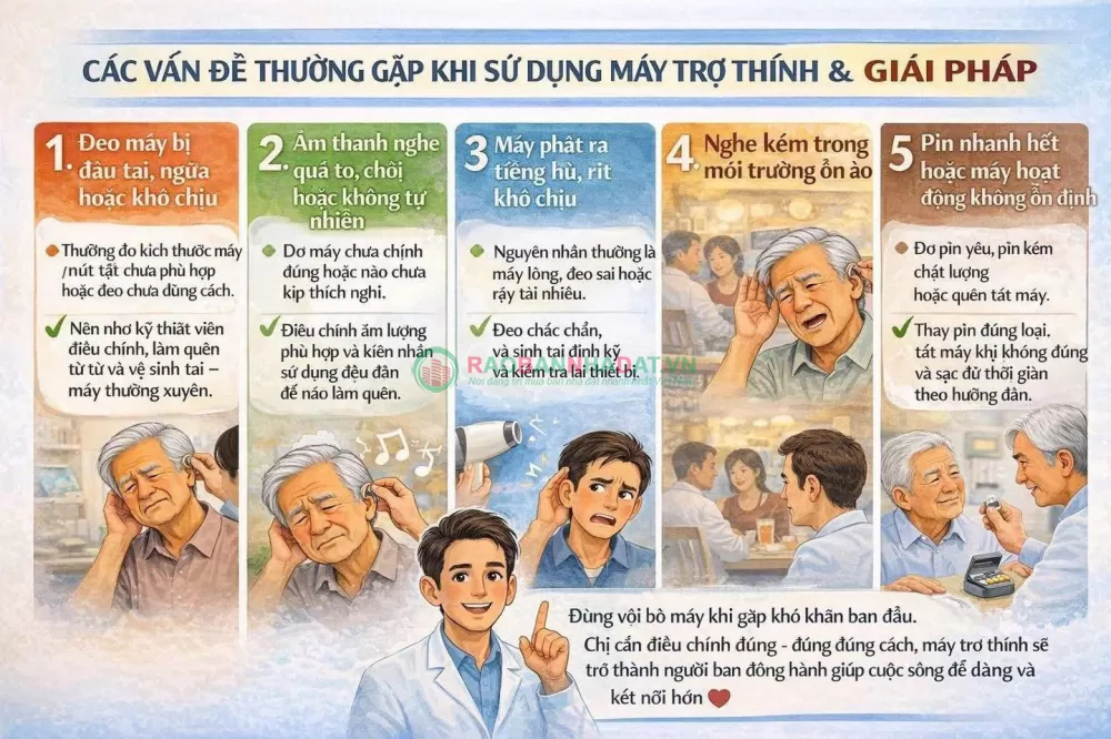 Nên nhờ kỹ thuật viên điều chỉnh, làm quen từ từ và vệ sinh tai– máy thường xuyên.