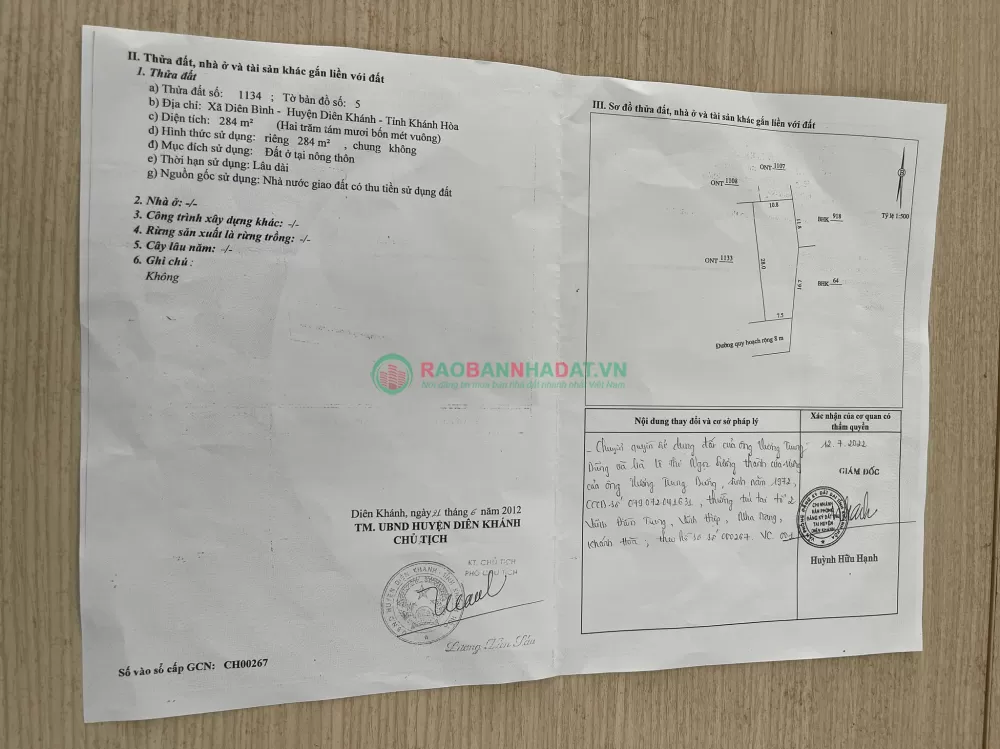 Bán đất Xã Suối Hiệp Huyện Diên Khánh Khánh Hòa, hướng Nam, có Sổ hồng, giá 1.278 tỷ