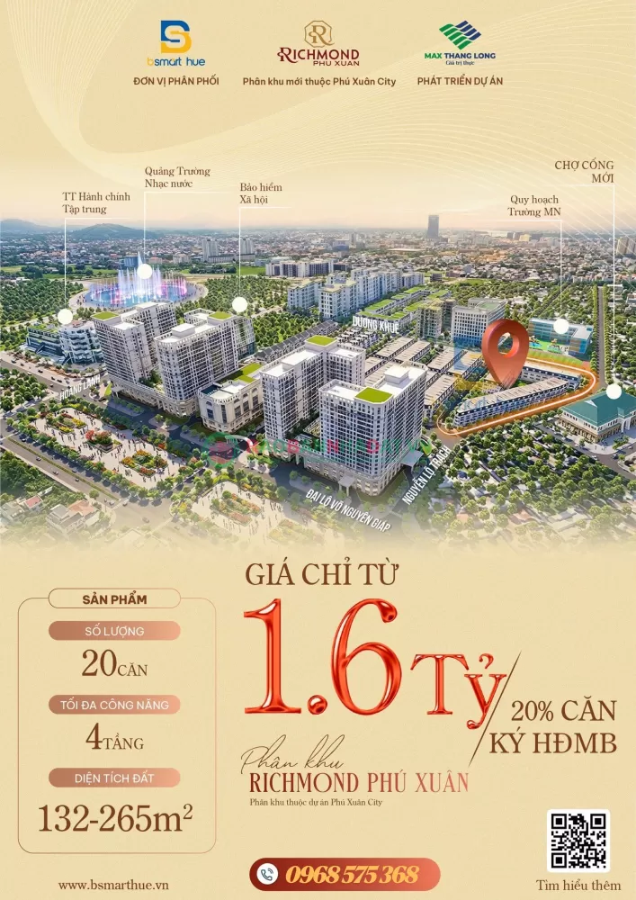 Anh chị có đang tìm kiếm một kênh đầu tư mà "Tiền nhìn thấy được - Dòng người chạm thấy được" tại Huế? Richmond Phú Xuân không bán lời hứa ở tương lai. Chúng tôi bán một Vị trí Vàng đang vận hành từng phút: 1⃣ Đối Diện Chợ Cống Mới: Tâm điểm giao thương sầm uất lâu đời của khu vực phía Nam Huế. 2⃣ "Túi tiền" khổng lồ: Phục vụ trực tiếp hơn 25.000 cư dân hiện hữu nội khu và luồng khách vãng lai cực lớn. 3⃣ Tâm điểm kết nối: Sở hữu 4 mặt tiền "đắt giá" (Võ Nguyên Giáp – Tố Hữu – Dương Khuê – Nguyễn Lộ Trạch). ĐẶC QUYỀN DÀNH RIÊNG CHO 20 KHÁCH HÀNG ĐẦU TIÊN: chỉ từ:ệ/̣́ - là tấm vé để anh chị sở hữu tài sản sinh lời bền vững, đón đầu sự bùng nổ của hạ tầng phía Nam TP. Huế. • Nhà phố thương mại 4 tầng • Diện tích đất 132 – 265m² • Mặt tiền thoáng – phù hợp kinh doanh • Pháp lý rõ ràng - Sổ hồng trao tay Nhanh tay giữ chỗ những vị trí đẹp – vị trí kinh doanh tiềm năng trước khi chính thức mở bán. Liên hệ ngay! —————————— :để nhận báo giá từng căn Group cập nhật tiến độ dự án:: https://zalo.me/g/bvirjm228 ̂́ - Phân phối & phát triển dự áń̂.