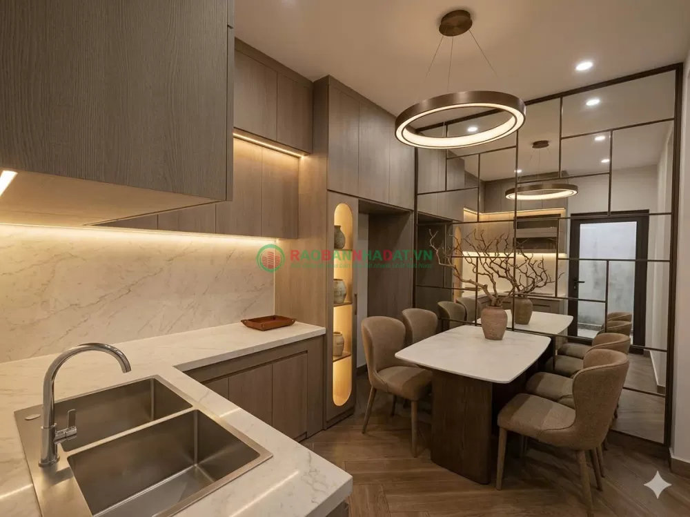 - Liền kề là nhà bếp thiết kế chữ L tối ưu diện tích, hệ tủ bếp trên- dưới.